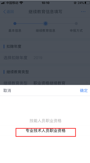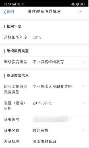 4、注意!!扣除年度目前仅可填报2019,继续教育类型选择“专业技术人员职业资格””发证日期/发证编号等按照实际证书信息填报。